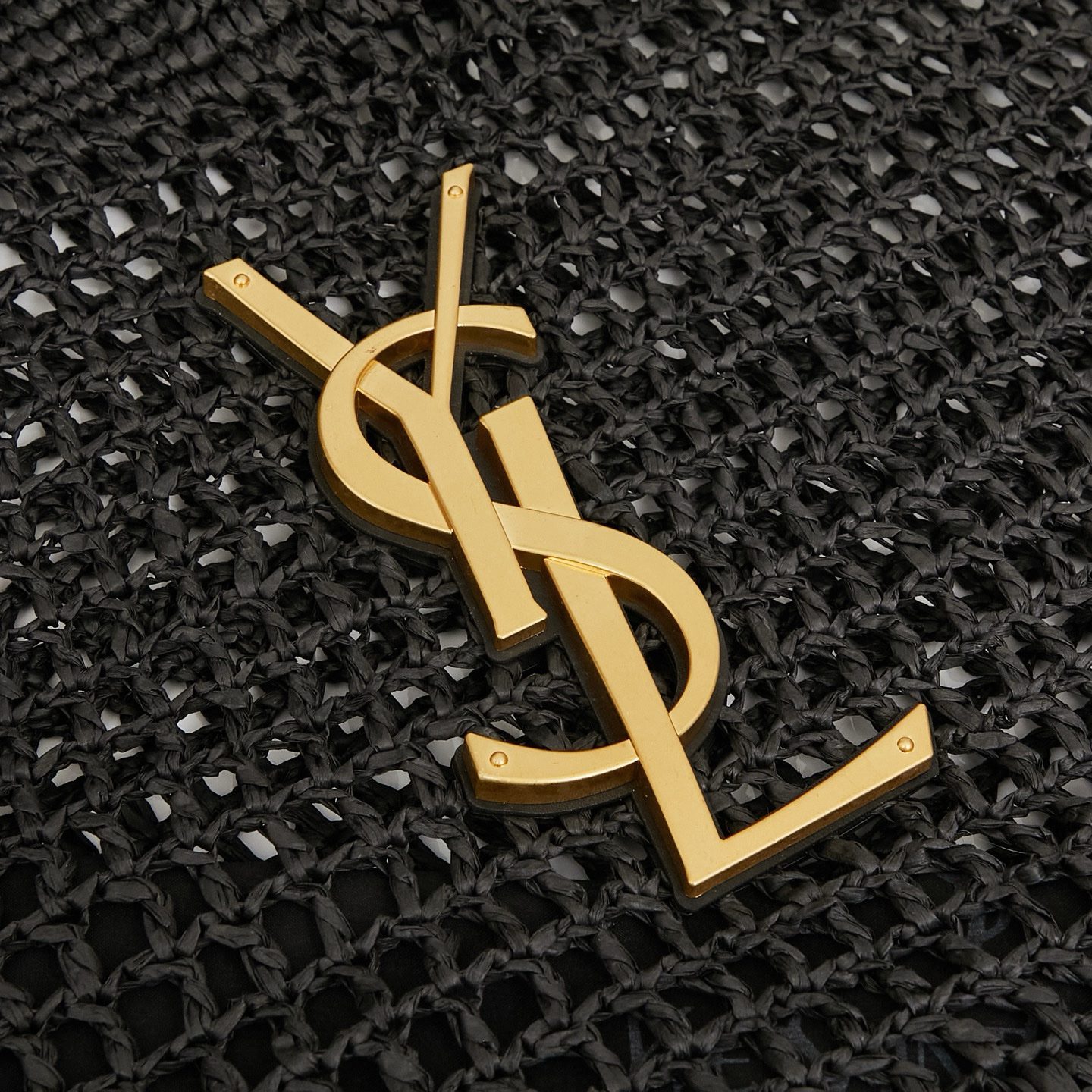 Shop the Black Saint Laurent Raffia Tote. This iconic summer essential includes a matching pouch and gold YSL logo for a sophisticated, high-end fashion statement.